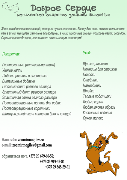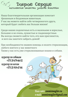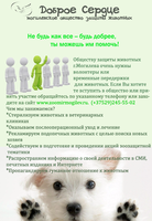 1. Нужно обновить листовку по котикам. 2. Сделать дополнительную листовку по собакам (тут же не все) 3. В листовках изменить сайт на by. (если конечно сохранён pdf и не нужно мучаться) 4. Добавить в те что есть и в дальнейшем, возле тел. номеров указывать что это (мтс, лайф, велком). Сейчас сложно сообразить где что, а людям это важно. 5.в этой листовке слова бездомным \ брошеным выделить жирным и увеличить на них шрифт (т.к. люди не догоняют с какими животными мы приходим и кого пристраиваем) Скрытый текст![]() 6. в список нужностей добавить (место там позволяет) Лекарства: глазные капли. В уход: лотки, переноски. Скрытый текст![]() 7. в листовку "Не будь как все" самый первый пункт должен быть о том что мы забираем животных с улицы, выхаживаем и пристраиваем в дом Скрытый текст![]() 8. Пора делать листовку посвящённую "Дню влюблённых"! ![]() Это сейчас уже будет актуально вешать в организациях, магазинах и пр. Что-то аналогичное новому году, только больше упор на корма и лекарства. Короче с учётом современных нужностей)) На сегодня для Ани распечала в цветном варианте: 6 листовок по собакам 9 листовок по котам 14 листовок "Не будь как все" 5 листовок со списком нужностей 12 листовок по раздаче животных Все они будут развешены в организациях, учреждениях и торговых точках. За что СПАСИБО АНЕ!!!!! печать остановила, т.к. катридж цветной закончился. Буду завтра смотреть на рынке по сборам и если будет с чего, то заправлю. Так что обращаемся за цветными листовками ко мне. (только не на столбы, не в почту и пр. А в хорошие добротные места!!!) Оставила 1 листовку по котам и 1 по собам - занесу в Акварай повешу. |