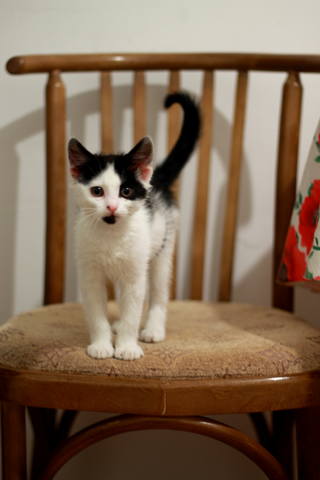 Котятки наши играются, понемногу привыкают к горшку, хотя иногда бывают осечки. Когда играются - на кухне небольшой торнадо. Мать котяток ищет всевозможные способы сбежать, часто сидит на окне и жалобно мяучит. Погладим, пожалеем, но всё равно её тянет на окно. Чёрненькая с белым признала во мне папочку, когда завтракаю она залазит ко мне на шею и мурлычет, помогает печатать на клавиатуре, и умеет выключать комп нажимая на кнопочку на клавиатуре. |