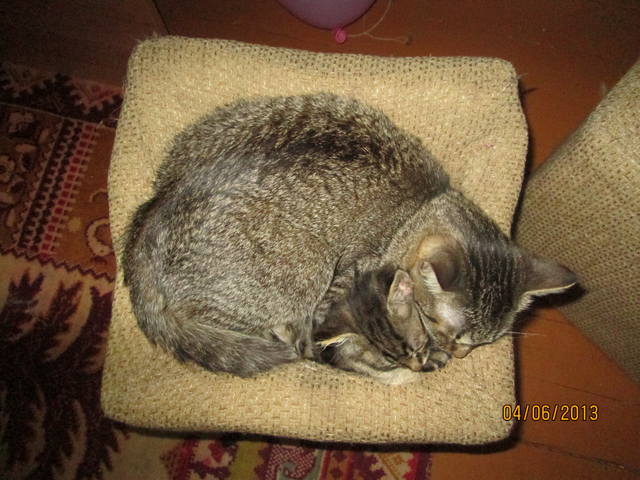 Есть у меня пуфик, который Поля продавила и теперь там такая вмятина, его облюбовали коты, видно удобно попы свои мостить, и один малек там спит сейчас, а теперь и Буська устроилась с ним.