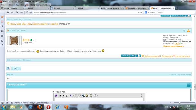 у меня опять что-то с форумом...вчера отписывалась в нескольких темах, и все было норм. даже согасия кто-то поставил под этим, а сегодня как будто я ничего не писала.. Добавлено через 2 минуты http://forum.dsmogilev.by/showthread.php?t=3026 вот например в этой теме, я после Дины отписывалась, а сейчас нету записи, и запись Дины написано 20 минут назад подана, а это ж вчера было..