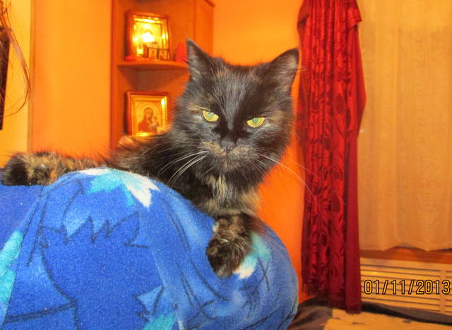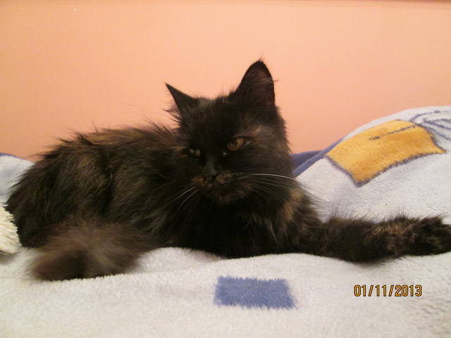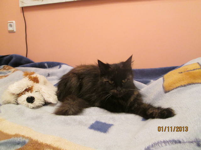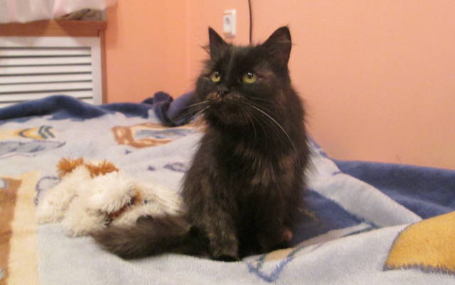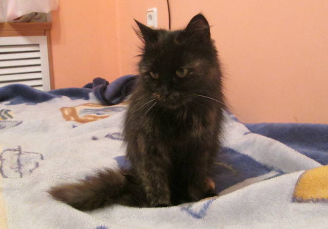 Эта кошечка жила у школы. Она была там совсем одна и видно голодала, т.к. она оооочень худая, из-за шерсти ее худобы не видно. Но когда я ее сегодня погладила, мои руки просто провалились под шерсть..., а там скелет, все кости пересчитать можно