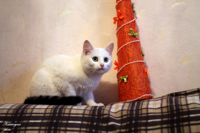 Мальчугану всего3,5 месяца. У него белоснежная шубка и огромные зеленые глубокие глаза...но постойте..что это за серо-черная полоска рядом с нашим Бралином?..а, это всего лишь его хвост!) Да, да вот такая необычная окраска у котика. Малыш ходит в лоток, в еде не прихотлив. Любит внимание и ласку, так же будет прекрасным компаньоном в играх. Был на осмотре ветеринара. Звоните, мы Вас ждем.